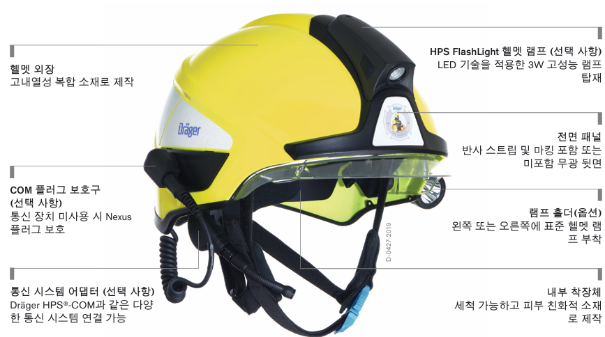 - 사이즈 조절장치가 헬멧 쉘 외부에 있어, 장갑을 착용한 상태에서도 손쉽게 조절가능 - 다방향에서 턱끈을 조절하여, 고정성과 안정성을 확보함 - 소방대원이 쉽게 액세사리(랜턴 등)을 탈·부착 할 수 있는 구조 - 착용자의 시야를 확보하면서 눈을 보호할 수 있는 헬멧 전면의 안면렌즈(안면보호대) - 헬멧 본체를 타고 흘러내리는 물이 방화복 안으로 들어가지 못하도록 하고, 착용자의 귀와 목을 보호할 수 있도록 헬멧의 측면과 후면에 부착 하는 물받이(귀덮개) | - 방화헬멧 : Type B - 중 량 : 1.4kg 이하(액세사리를 제외한 본체 무게) - 크 기 : 50cm ~ 66cm (머리둘레) - 재 질 : 유리섬유 강화플라스틱 (Fibreglass-reinforced) - 색 상 : 검정색, 청색, 적색, 형광연두색 - 본체 및 부착물은 불연성 소재를 사용(반사스티커 등) * 인증 한국소방산업기술원의 방화헬멧 KFI인정을 득한 제품 EN 443:2008 소방용 화재진압헬멧(빌딩 및 기타구조물의 화재진압용) EN 16471:2014 산불진화 안전헬멧 EN 16473:2014 소방구조 안전헬멧 | - 고글 - 전면형 랜턴 - 측면 랜턴 - 후면형 라이트(파란색, 흰색, 적색) - HPS®-COM |