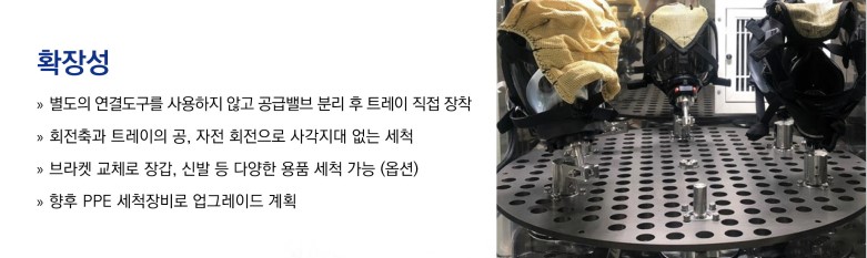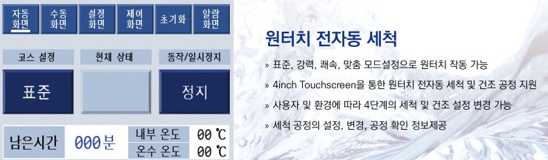 - 원터치 전자동 공정으로 사용자의 선택 및 필요에 따라 세척의 공정은 표준, 쾌속, 강력, 맞춤, 탈수 및 건조의 5단계로 설정이 가능할 것 - 면체 세척부는 공자전 회전으로 사각지대를 최소화하여 세척이 가능하며, 세척부 트레이 교체를 통한 장갑, 안전화, 각종 헬멧의 세척 및 건조가 가능한 구조일 것 - 세척 공정중 내부를 확인할 수 있는 LED 램프가 설치 되어 있으며, 건조시 자외선 램프를 이용하여 면체를 살균 할 수 있는 구조일 것 - 면체 세척부 회전 모터 BLDC(Brushless Direct Current Motor)는 반영구적 내구성 및 저소음 낮은 소비전력 구조일 것 - 구동부는 무급유 방식의 하이브리드 베어링 채택으로 그리스에 대한오염이 없을 것 - 상, 하 분사 노즐을 적용하여 세척조의 오염을 방지할 수 있는 구조이며, 세척력 강화를 위해 디지털 온도제어가 가능할 것 - Safety Interlock 기능에 의한 세척시 도어잠김 기능을 수행하고 도어열림시 자동으로 공정을 정지하며, 누수, 과열, 수조이상(저수위, 고수위)등의 각종 에러를 검출하여 안전을 위해 장비의 작동을 일시적으로 중단 할 수 있는 구조일 것 - 바퀴는 이동 및 고정이 가능한 구조일 것 - 프레임 재질 : SUS 304 각관 용접 커버 : SUS 304 |