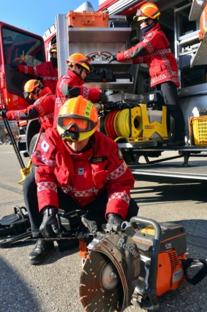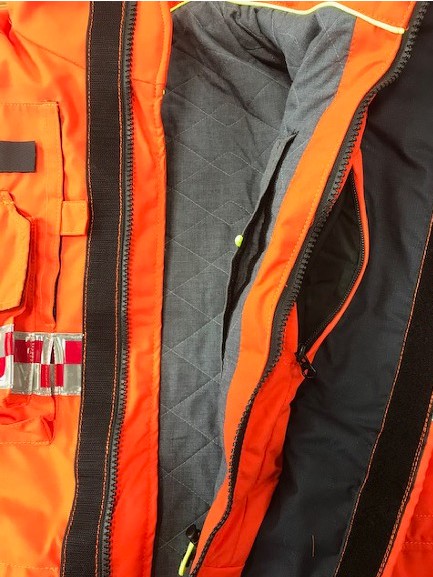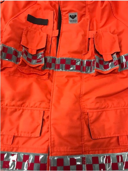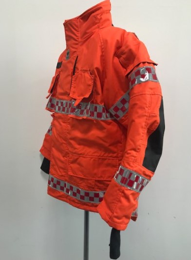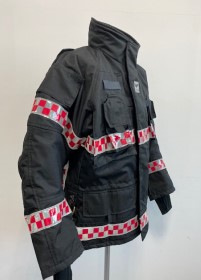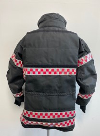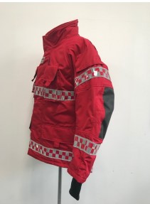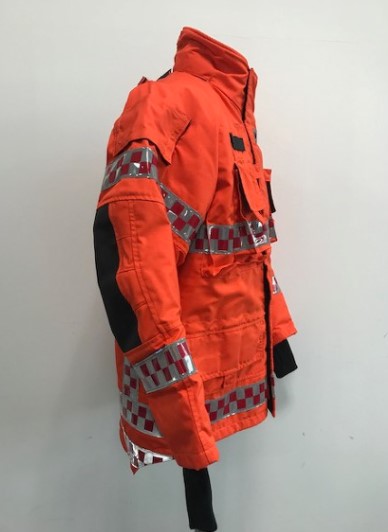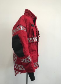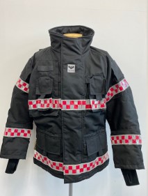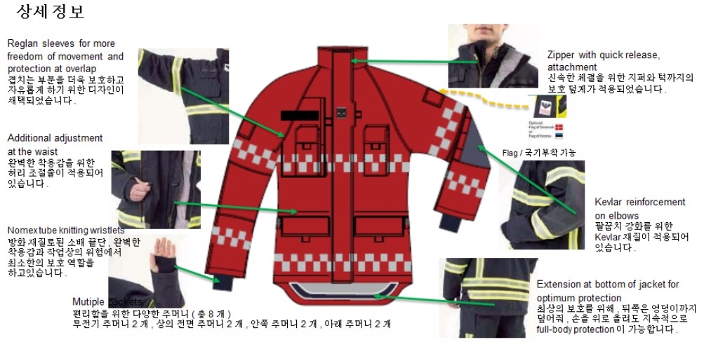 - 겉감 : Aramid 100% 로 제작되어 방화 및 방열 기능 보유 (220g/m2) - 중간증 : Topa (토파즈) 재질로 외부의 차가운 공기는 차단하고 내부의 보온 기능을 강화 하였으며, 공기 방울(엠보싱)형태로 통풍 기능을 최적화함 (145gr/m2) - 안감 : Ibena thermal liner 재질으로 보온용 안감 채택 (Ara 175g/m2 +Nmx/Visc 125gr/m2 ) - 팔꿈치 : 케블라(Kevlar)를 덧대어 강도와 탄력성을 높임 - 소맷동 : 손 전체를 감싸는 니트(손등 토시) 포함 | - 목 및 허리 조절 끈 ( 축 이 있는 재질 사용) - 작전간 자켓을 타이트하게 밀착 시킴으로서 원활한 활동성 보장, 야광 반사 테이프 (빛에 의한 노출 효과가 극대화된 Red/grey 체크 무늬 형태) - 야광 반사 테이프 - 몸통 : 세로 2줄, 가로 2줄 - 팔부위 : 3줄 | - 사이드 포켓2개, 가슴위치 무전기 및 휴대폰용 포켓 2개 - 세로형 안쪽 포켓 1개, 랜턴걸이 2개, D링 2개, 지퍼 및 벨크로 - 타입의 후드 1개, 등부위 벨크로 타입의 가로 개봉형 포켓1개 |